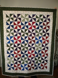 This one is for the son of my first cousin's daughter. She helped me move this last summer and this is a "thank you for letting me borrow mommy" gift. The colors in this one are red, blue, green and deep plums. The background has teeny little stars in similar colors but they don't match exactly.